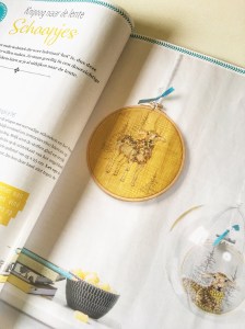 Naast een artikel van het omhaken van bloempotten een item met borduurstempel Schaap. Een gestempeld en geborduurd schaap in een borduurring en een schaap in borduurring in een transparante bol.